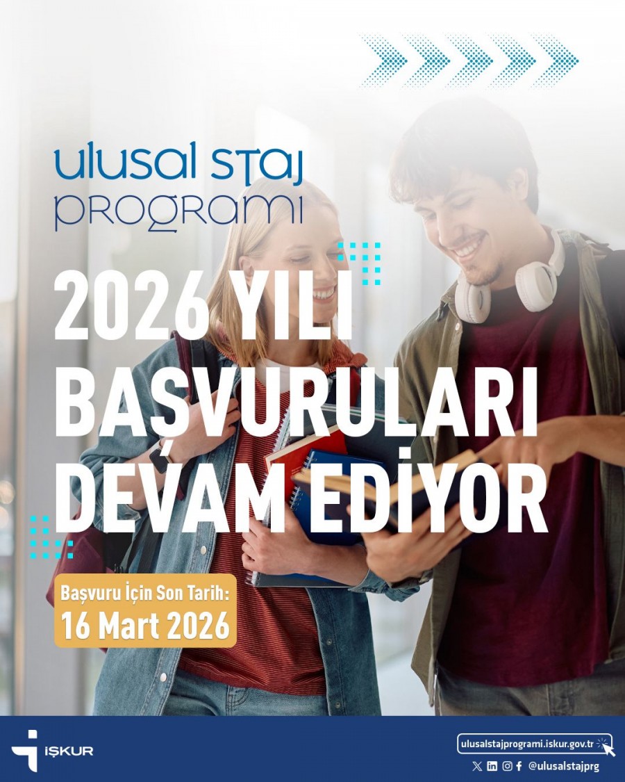 Cumhurbaşkanlığımız himayelerinde, Türkiye İş Kurumu (İŞKUR) tarafından yürütülen Ulusal Staj Programı kapsamında 2026 yılı başvuruları devam etmektedir. Program için son başvuru tarihi 16 Mart 2026'dır.